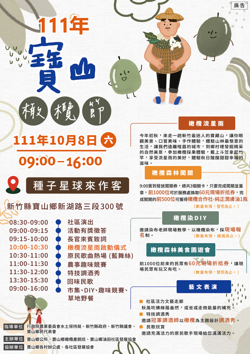 今年活動將於111年10月8日(星期六)08時30分至16時在寶山鄉油田村-種子星球(新竹縣寶山鄉新湖路三段300號‧油田集會所旁)正式揭開橄欖季的序幕。